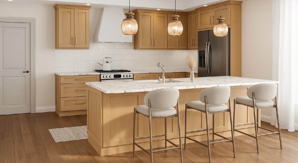 Designers are moving away from sterile minimalism and embracing organic textures and biophilic design. Our curated mid-tone woods are exclusive to RTA Cabinet Store’s online collection, chosen for their natural elegance and on-trend appeal.